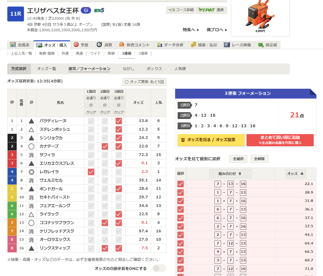 - 【エリザベス女王杯2025】回収率200%超を狙う!1番人気軸から万馬券を獲る3連複21点勝負! 2025年11月15日
