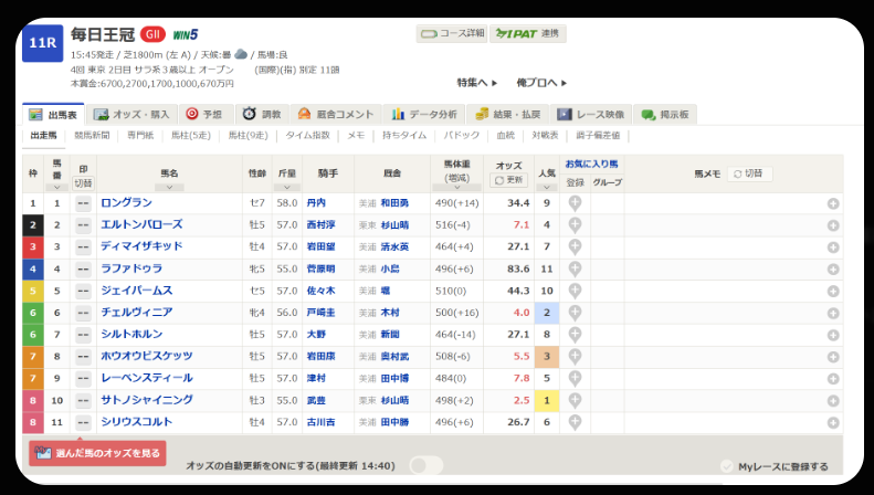 今年の毎日王冠は11頭立てと少頭数ながら、上位人気が拮抗し、オッズが割れています。この状況は、**特定の馬に資金を集中投下し、高配当を狙う**戦略が有効であることを示唆しています。