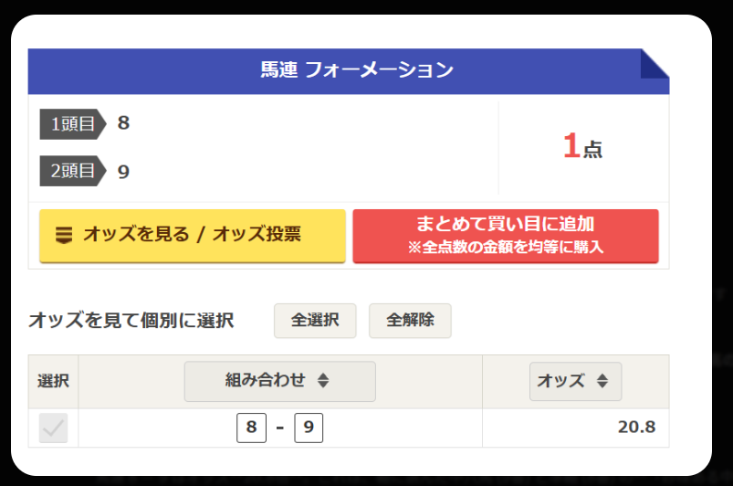 ⑧ – ⑨ | 20.8倍 | 1,000円 | 最大利益狙い。中穴同士の組み合わせで最も期待値が高い。 |