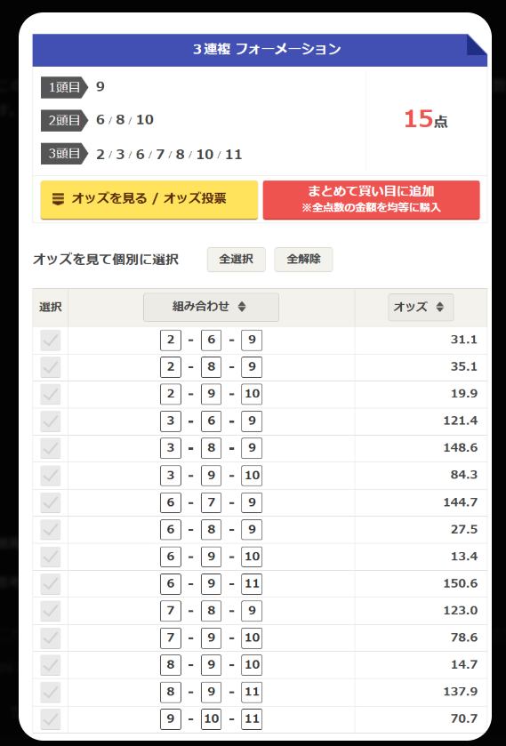 3連複 | 3-8-9 / 6-9-11 / 7-8-9 / 6-7-9 / 8-9-11 / 3-9-10 | 6点 | 計3,500円(高配当重視) | オッズ84倍〜150倍の万馬券ゾーンに集中投資。 |