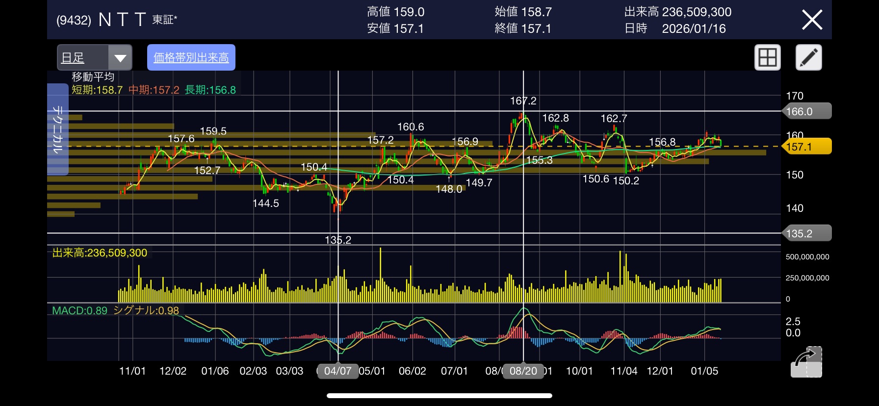 2026年1月16日時点の終値は157.1円となっており、現時点では含み益の状態です。しかし、直近では160円手前で上値を抑えられる展開も見られ、短期的な上値の重さも感じます。