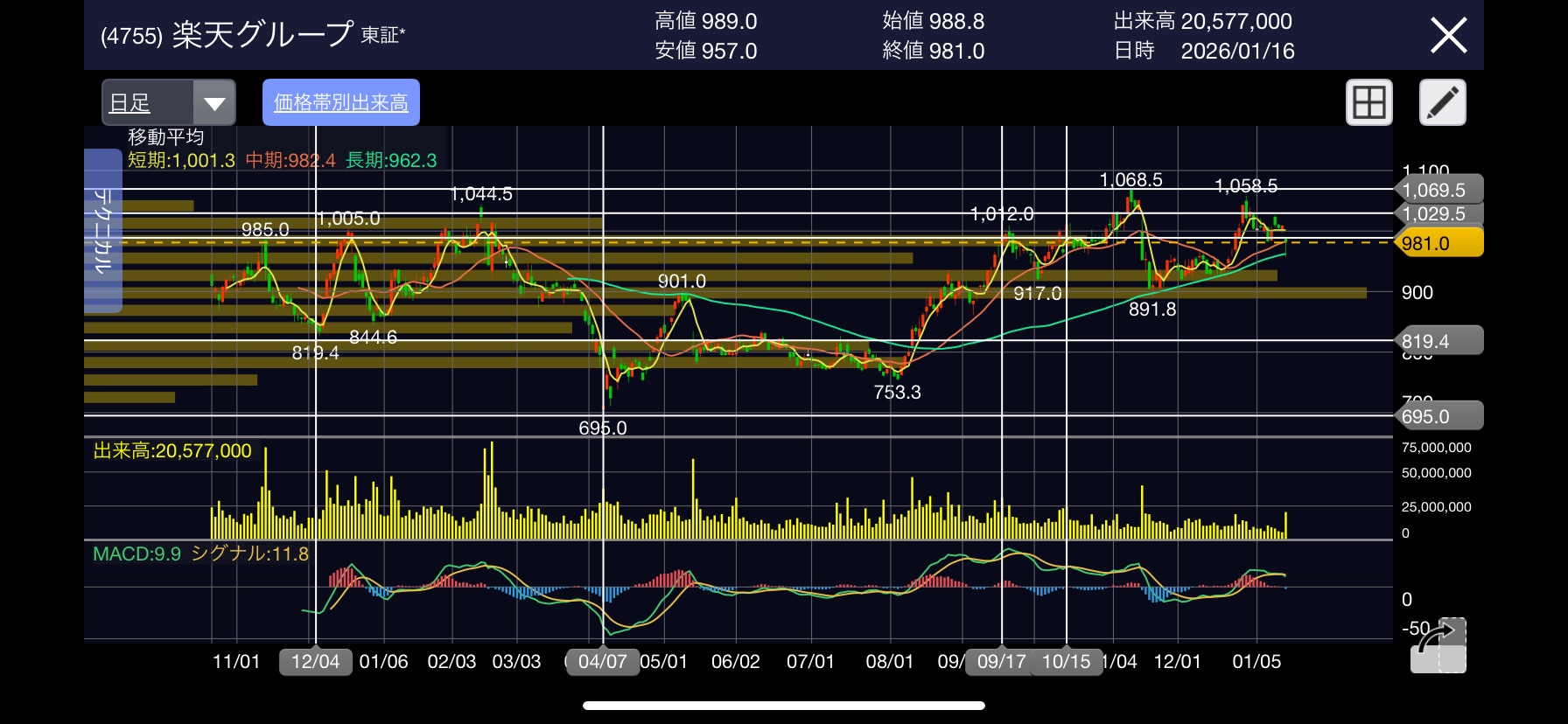 - 価格帯別出来高:900円から950円付近に厚い出来高の壁があり、ここが強固な下値支持線として機能していることが視覚的に確認できます。
