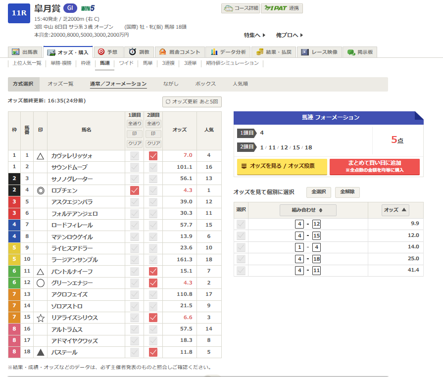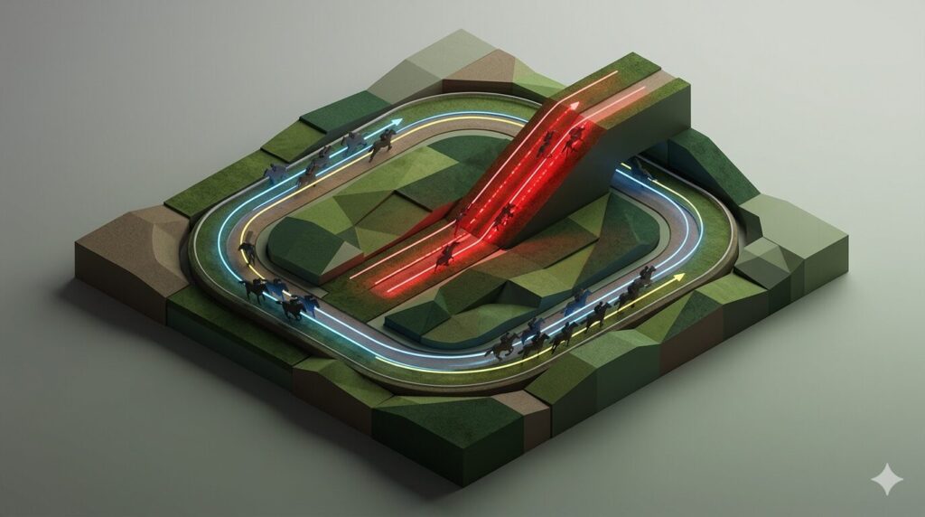 攻略のポイントは、中山の急坂を2回越えるスタミナと、荒れ始めた内馬場を避けて外から勢いよく回せる機動力です。開幕から使い込まれた今の芝状態では、単なるスピード決着ではなく、タフな持続力勝負になる可能性が極めて高いといえます。