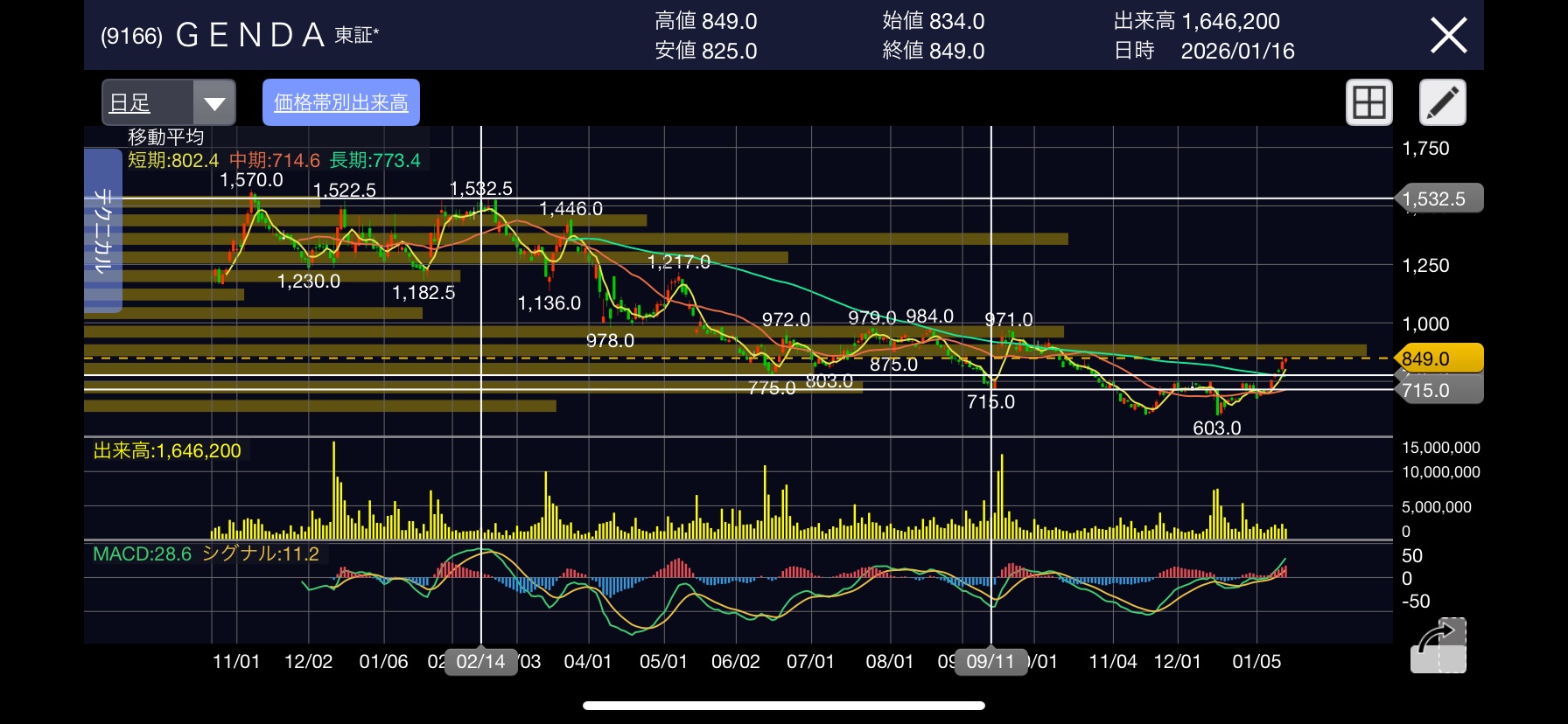 - 価格帯別出来高:849円付近の節目を力強く上放れたことで、上値が軽くなる展開を想定しました。