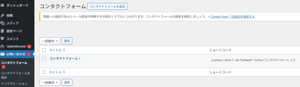 ここから「コンタクトフォーム」を開き、最初から用意されている「お問い合わせフォーム 1」をクリックして編集しましょう。